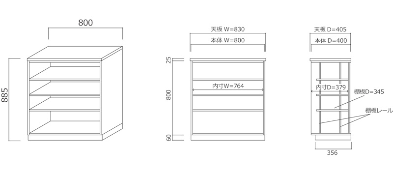 無垢造作家具 カウンターキャビネット パイン 無塗装 ZC-PMN-N001 W830×H885×D405mm