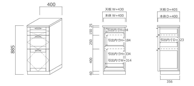 LOHAS material(ロハスマテリアル) 無垢造作家具 カウンターキャビネット パイン 無塗装 ZC-PM4-T060 W430×H885×D405mmの説明