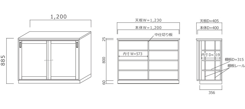 無垢造作家具 カウンターキャビネット パイン 無塗装 ZC-PM4-T132 W1230×H885×D405mm