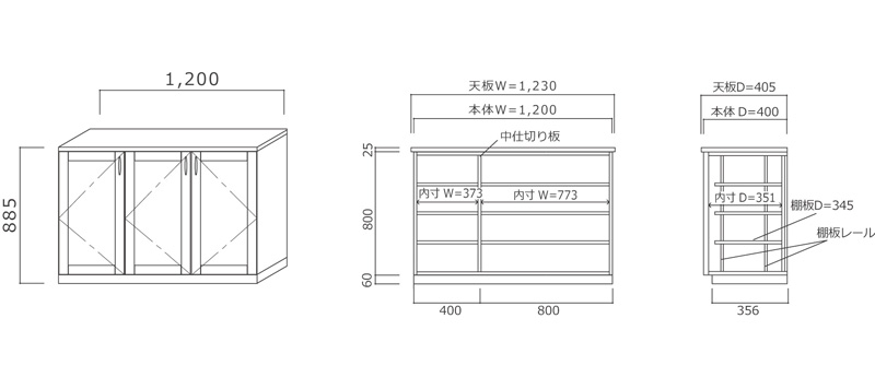 無垢造作家具 カウンターキャビネット パイン 無塗装 ZC-PM4-T192 W1230×H885×D405mm