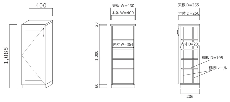 LOHAS material(ロハスマテリアル) 無垢造作家具 ハイカウンターキャビネット パイン 無塗装 ZH-PM4-T010 W430×H1085×D255mmの説明