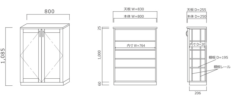 無垢造作家具 ハイカウンターキャビネット パイン 無塗装 ZH-PM4-T031 W830×H1085×D255mm