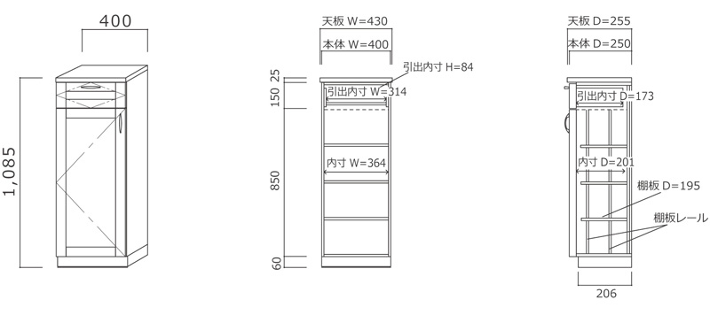 LOHAS material(ロハスマテリアル) 無垢造作家具 ハイカウンターキャビネット パイン 無塗装 ZH-PM4-T070 W430×H1085×D255mmの説明