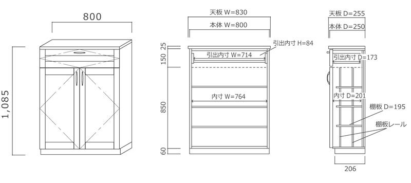 LOHAS material(ロハスマテリアル) 無垢造作家具 ハイカウンターキャビネット パイン 無塗装 ZH-PM4-T081 W830×H1085×D255mmの説明
