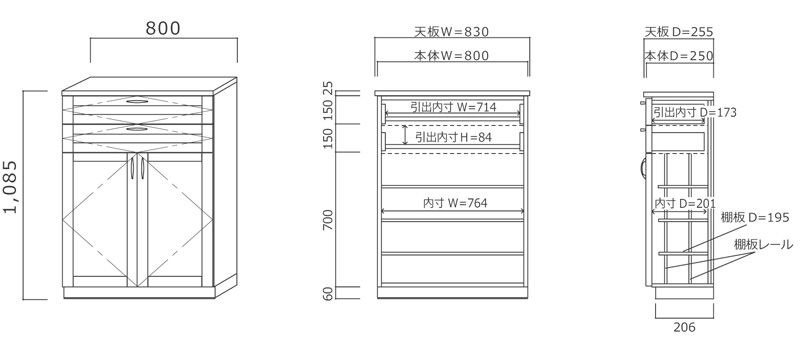 無垢造作家具 ハイカウンターキャビネット パイン 無塗装 ZH-PM4-T101 W830×H1085×D255mm