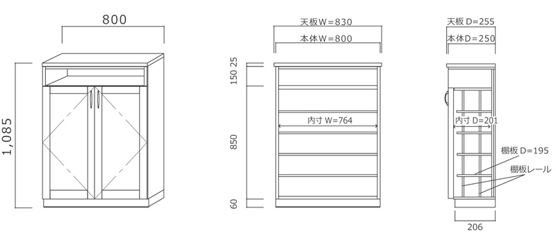 LOHAS material(ロハスマテリアル) 無垢造作家具 ハイカウンターキャビネット パイン 無塗装 ZH-PM4-T121 W830×H1085×D255mmの説明