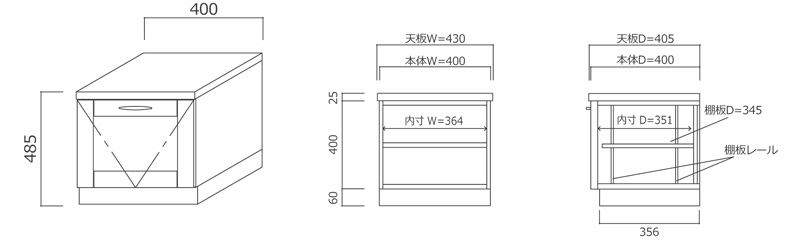 無垢造作家具 カウンターキャビネット パイン 無塗装 ZC-PM4-T060 W430×H885×D405mm