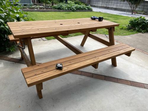 アメリカの公園にあるような、頑丈そうな木製ピクニックテーブルだったので。