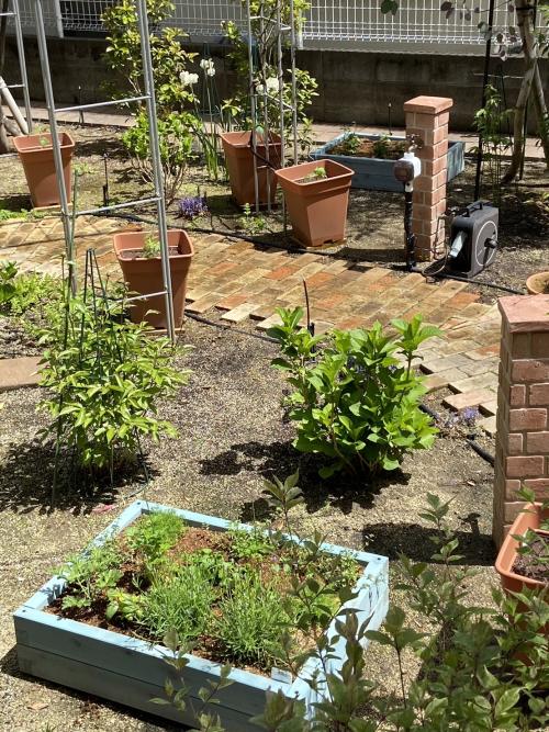 家庭菜園のグリーンと合わせてレイズドベッドがお庭を彩り、とても素敵ですね。