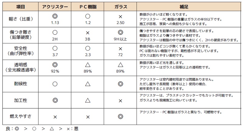 アクリスターとガラス・PC(ポリカーボネート)樹脂の物性比較