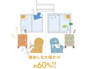 • 遮熱高断熱複層ガラス入インプラスを使うと、室外側ガラスにコーティングした特殊金属膜により、夏の強い日差しを約60%カットし、冷房効果を高めます。室内の明るさはそのままに、窓から入る熱をカットし、紫外線も大幅に遮断。健康を守るのはもちろん、嗅ぐやインテリアの色あせも防ぎます。