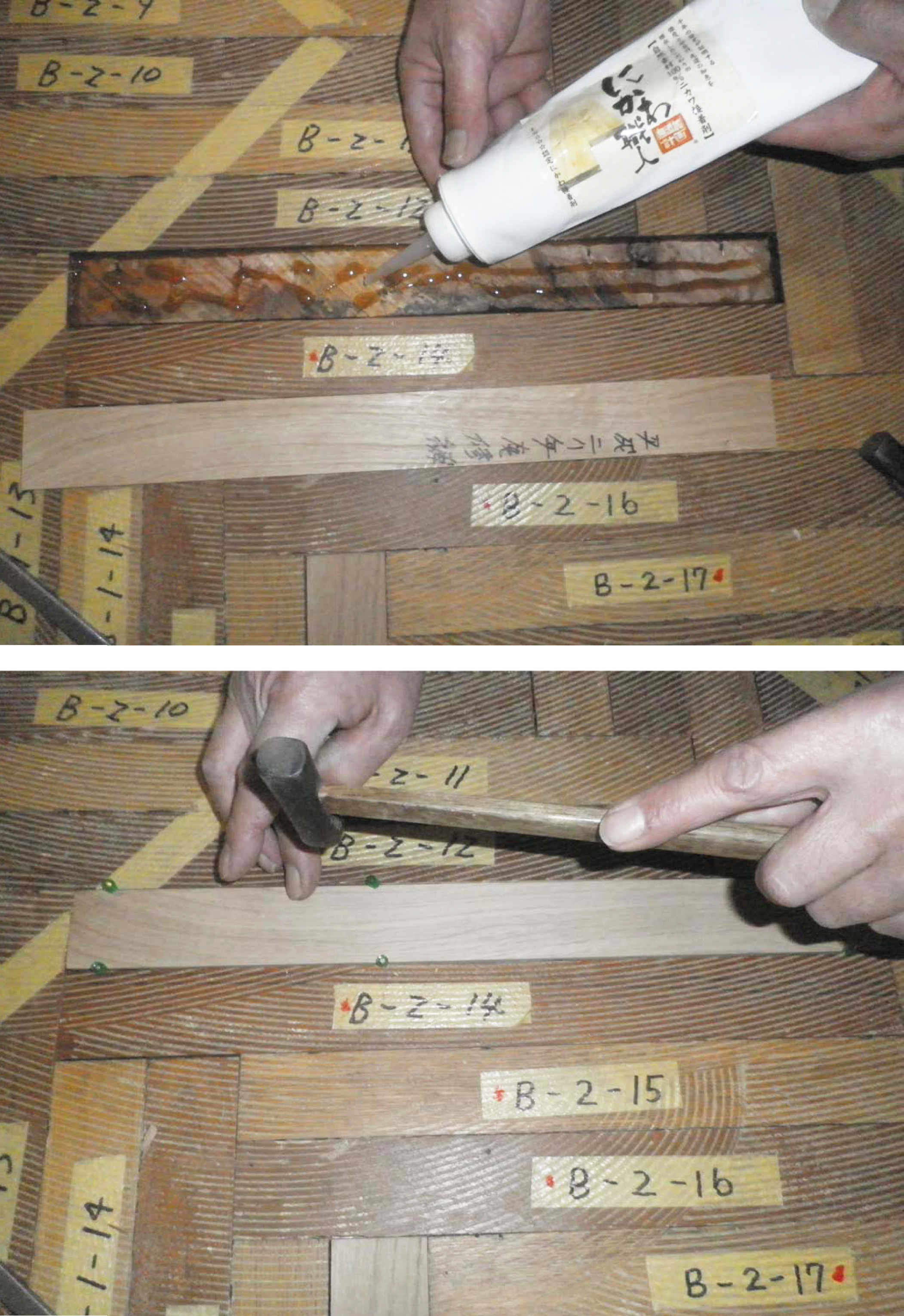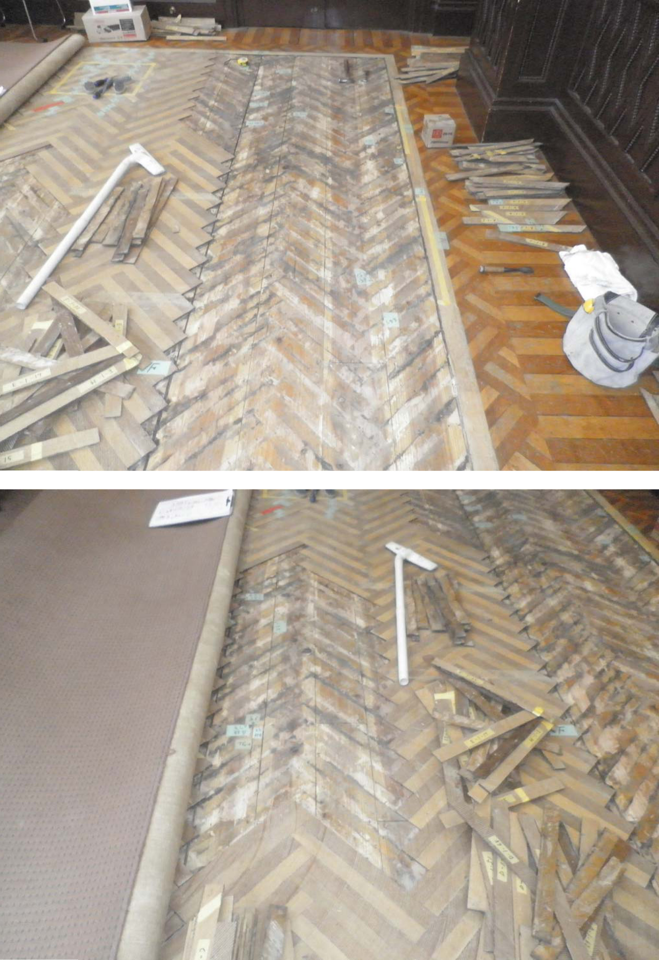 今回の工事は、寄木張りの修復工事とのことです。
