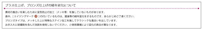 ブロンズタイプは、メッキした上に特殊なステイン加工を施してクラシックな風合いを出しています。お手入れに研磨剤を含んだ洗剤を使用しないでください。ご使用環境により変化の具合が異なります。