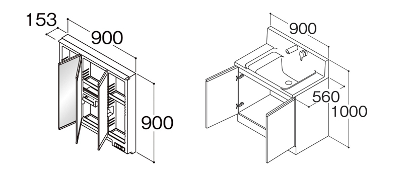 Housetec(ハウステック) 洗面化粧台 COCOSH(ココッシュ) 間口900 開き扉タイプ 三面鏡(スリムLED照明付き) 扉Aカラー 一般地仕様の説明